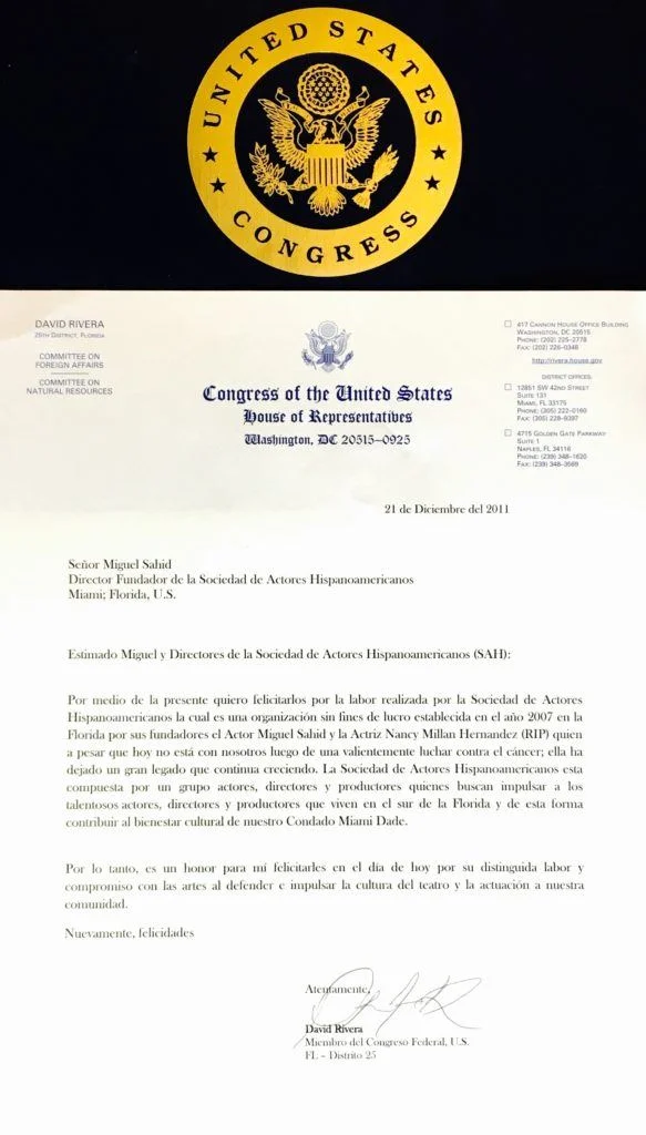 Dear Miguel and directors of the Hispanic-American Actors Society (SAH). Please receive this formal letter as a congratulatory for the work done by your not for profit organization, established in 2007 in Florida by its founders: Actor Miguel Sahid, and the late actress Nancy Millan Hernandez, who despite not being with us anymore and having waged a brave battle against cancer, left us with a legacy that continues to grow. The Hispanic-American Actors Society is formed by a group of actors, directors, and producers who seek to catapult talented actors, directors, and producers that live in South Florida and thusly contribute to the cultural well being of our Miami-Dade county. Therefore, it is an honor to extend my congratulations on this day for their distinguished work and commitment to the arts both defending and driving the culture of theatre to our community. Once again, congratulations!